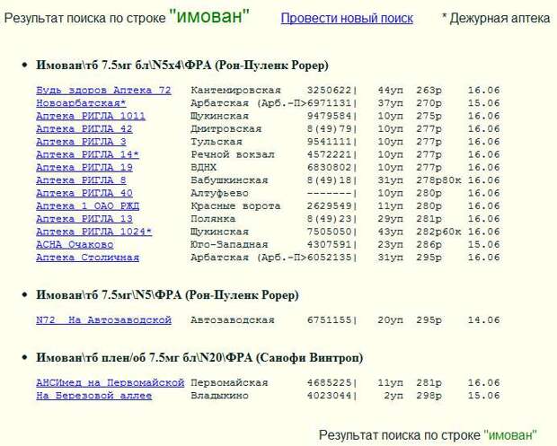 Искать лекарства очень просто: достаточно ввести название в поле для поиска, расположенное вверху страницы, и нажать кнопку «Найти». И вы моментально увидите результат. Причем можно искать по всем аптекам или только по дежурным. Но даже и это не помеха: в результатах поиска в числе обычных аптек есть и дежурные, они отмечены звездочкой.